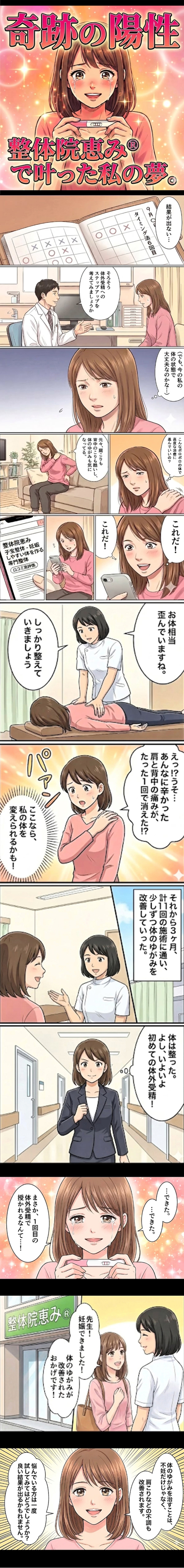 ※ こちらの漫画は、整体院恵みの「こつばんバランス子宝療方®」の施術を受けて妊娠された方の感想を基に作成した漫画で、すべての方の妊娠を保証するものではありません。