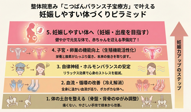 「妊娠力を高める」ために、骨盤の後傾、腰椎・胸椎の後弯姿勢を、無痛のやさしい施術「子宝コース」で、